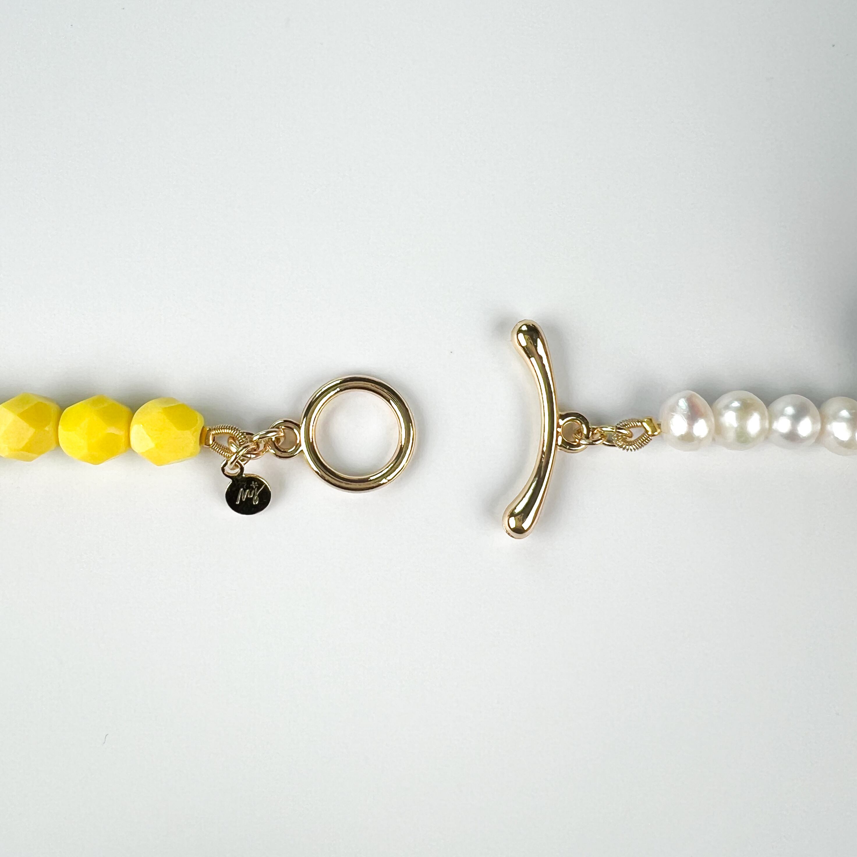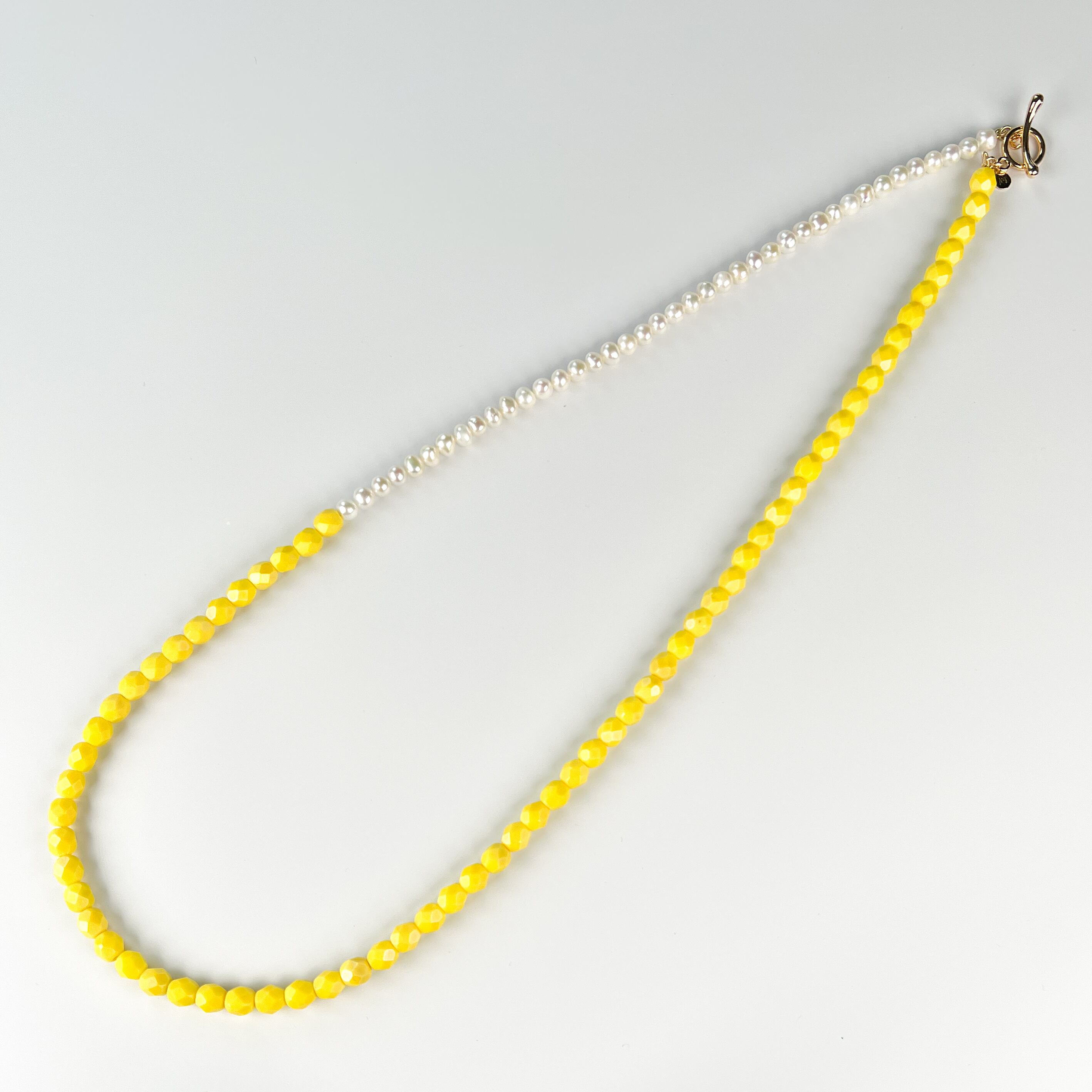マットでオーロラがかかったようなレモンイエローのビーズに、ぽてっとかわいい淡水パールの組み合わせは、myro jewelならでは!!