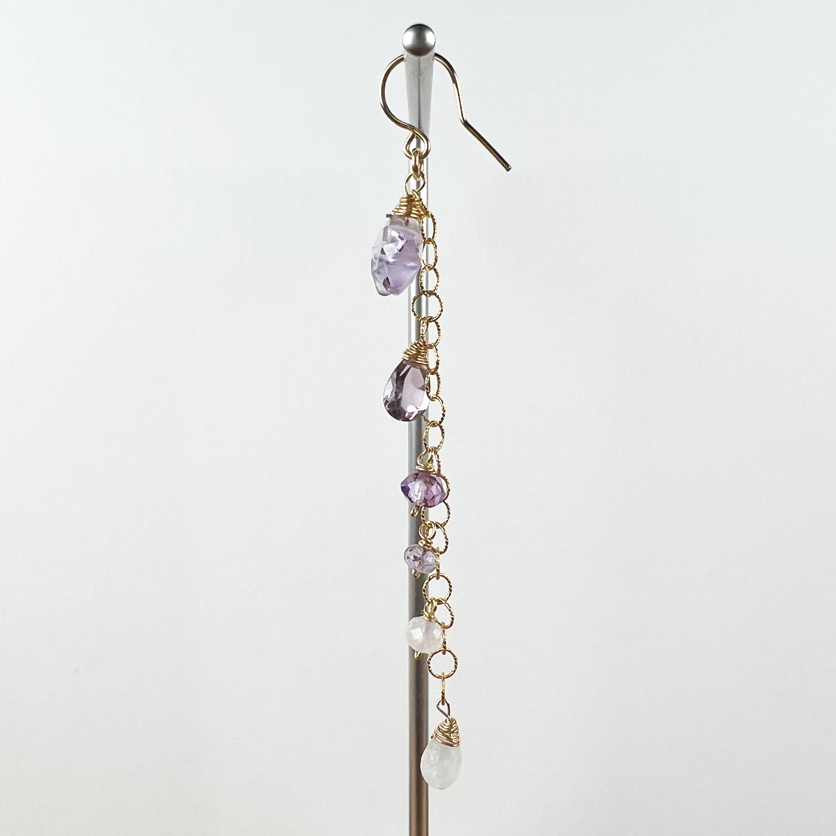 デザイナー SAYOさんのライフワーク“旅するアトリエ”で、バンコクで作られた月と星のアメシストが煌めくロングピアスです。