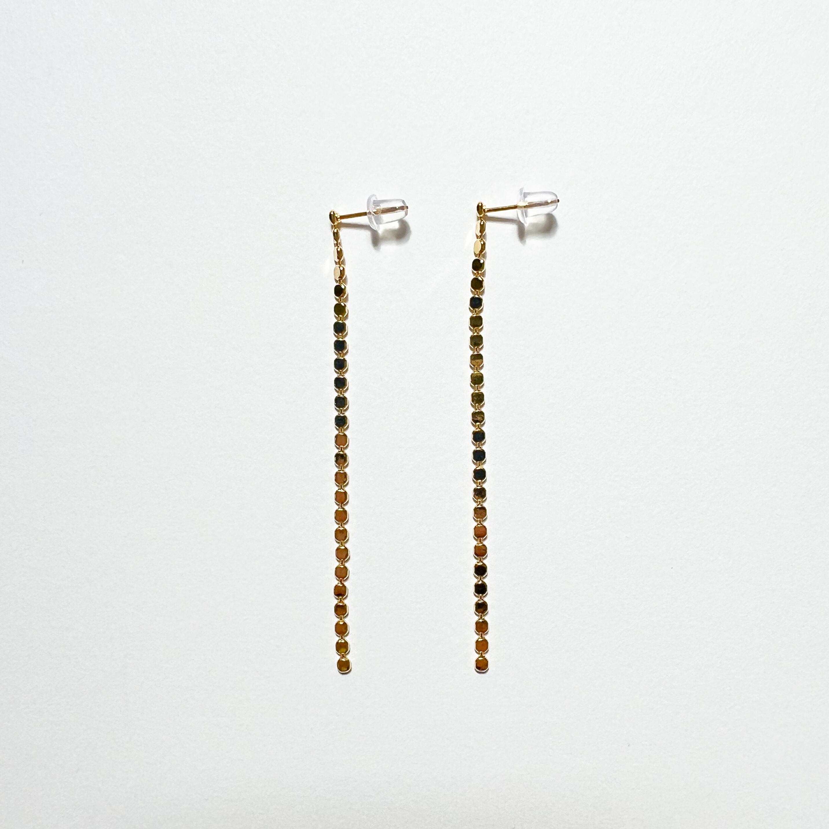 ラウンドのパーツが連なったチェーンのピアスです。